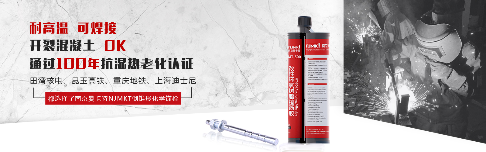 曼卡特定型化學(xué)錨栓,耐高溫,可焊接,防開(kāi)裂,中國(guó)名優(yōu)產(chǎn)品,由平安保險(xiǎn)承保。已成功用于上海迪士尼樂(lè)園、南京地鐵四號(hào)線、蘇州地鐵、昆玉高速等重要項(xiàng)目。
